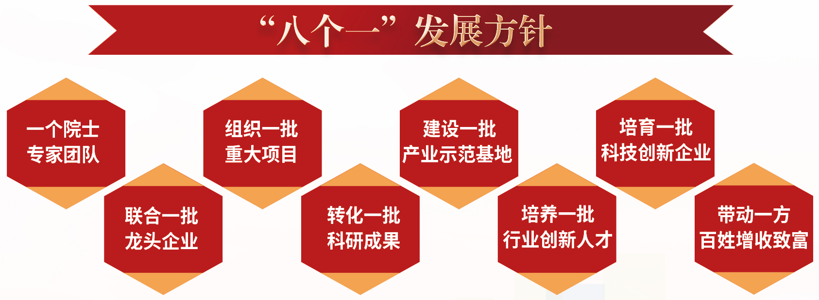 研究院贯彻落实“八个一”发展方针:一个院士专家团队,联合一批龙头企业,组织一批重大项目,转化一批科研成果,建设一批产业示范基地,培养一批行业创新人才,培育一批科技创新企业,带动一方百姓增收致富。坚持以院士专家团队为核心,以云南高原特色农业产业化发展需求为主线,以提升科研成果转化效率为工作方向,以科技创新护航云南农业发展,多措并举助力乡村振兴,推动云南农业产业高质量发展。