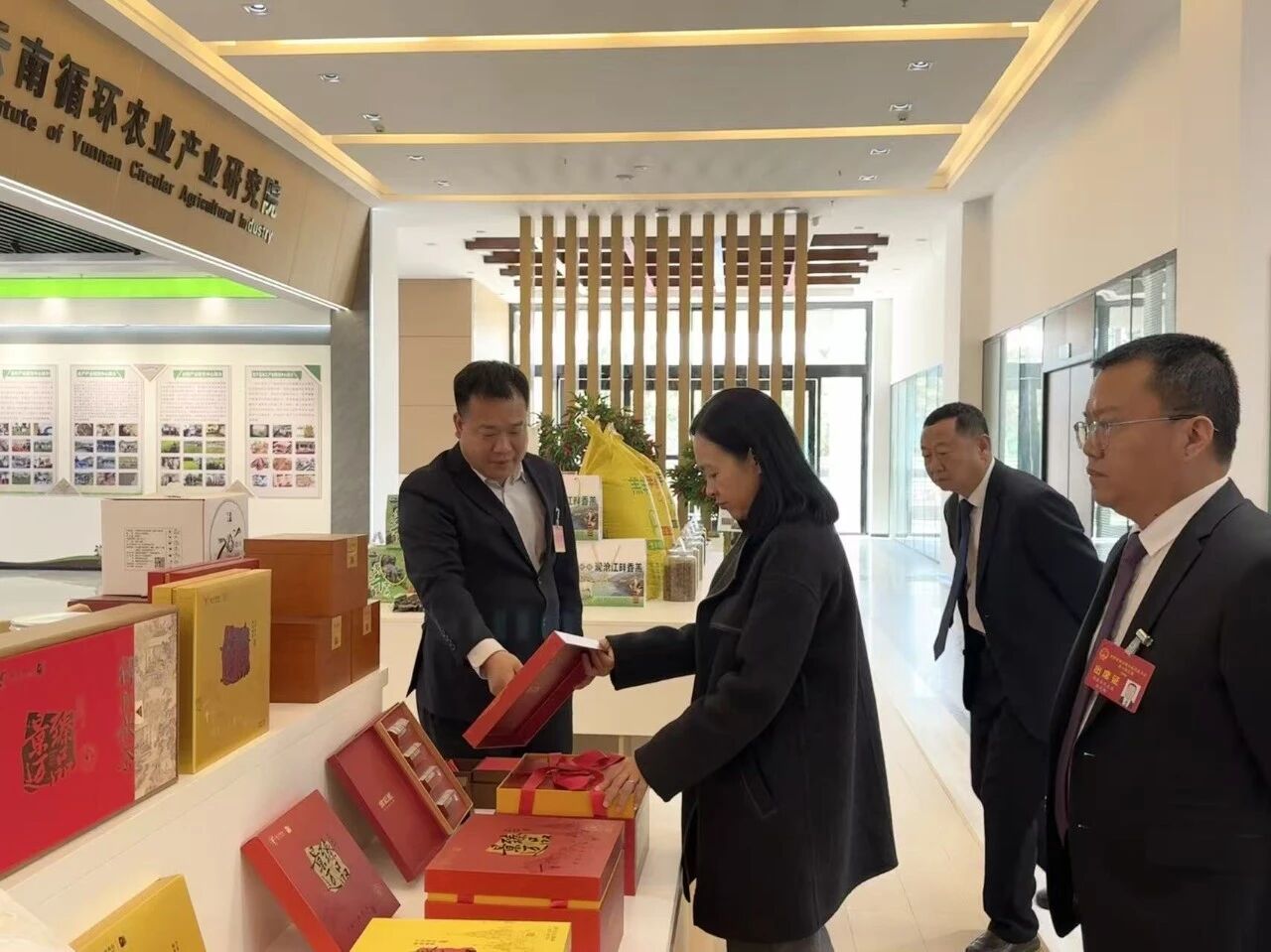 代表团一行实地参观了研究院科研成果展厅,听取了研究院在循环农业关键技术攻关、创新平台建设、科技成果转化及近年来在服务地方特色农业发展等方面取得的成效。
